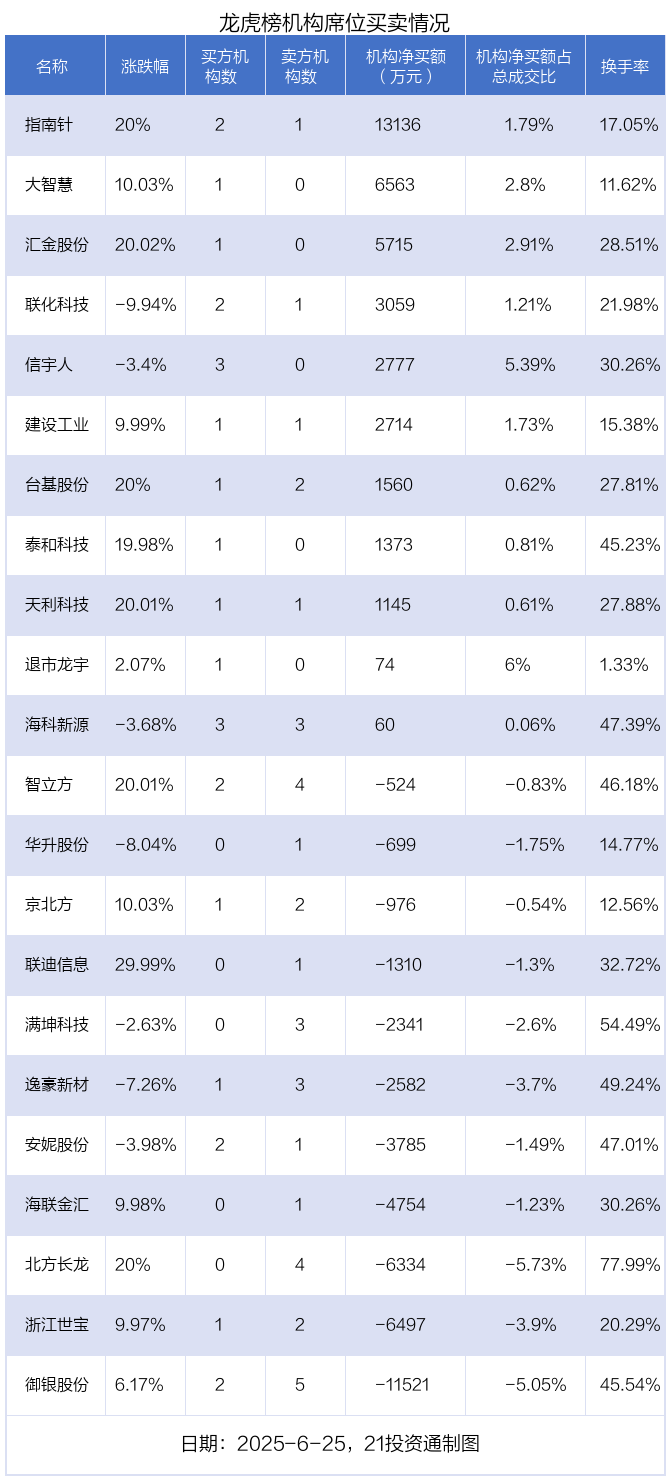 6月25日,22只个股龙虎榜出现了机构的身影,机构合计净卖出3147.7万元。具体来看,机构净买入11股,净卖出11股。