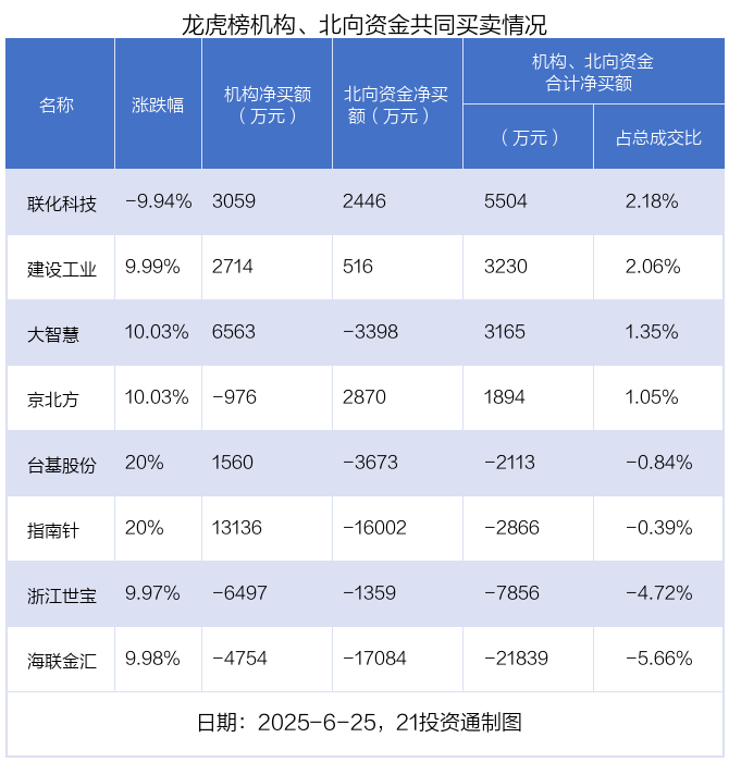 值得注意的是,机构和北向资金共同净买入了联化科技、建设工业等2股;共同净卖出了浙江世宝、海联金汇等2股;在京北方,大智慧,台基股份,指南针上出现分歧,机构净卖出京北方976万元,北向资金净买入2869.82万元;机构净买入大智慧6562.82万元,北向资金净卖出3397.96万元;机构净买入台基股份1560.31万元,北向资金净卖出3673.48万元;机构净买入指南针1.31亿元,北向资金净卖出1.6亿元。