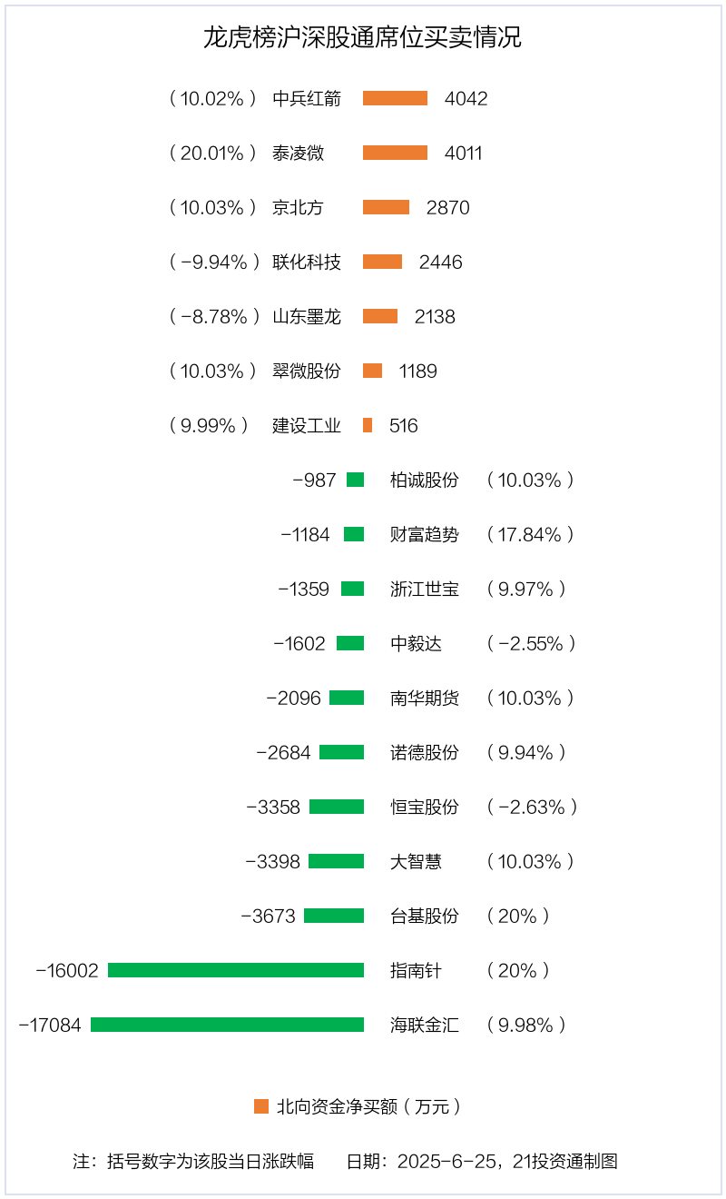 6月25日,北向资金参与龙虎榜中的个股共有18只,合计净卖出3.62亿元。其中沪股通净买入2股,净卖出6股,合计净卖出6750.08万元;深股通净买入5股,净卖出5股,合计净卖出2.95亿元。