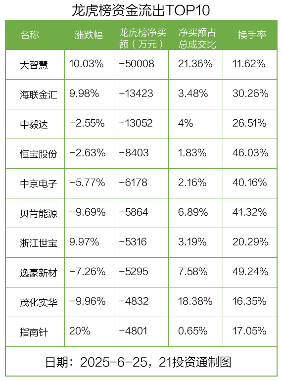 而龙虎榜中资金净流出最多的是大智慧(601519.SH),被净卖出为5亿元,占总成交金额的21.36%。大智慧收盘上涨10.03%,换手率为11.62%。