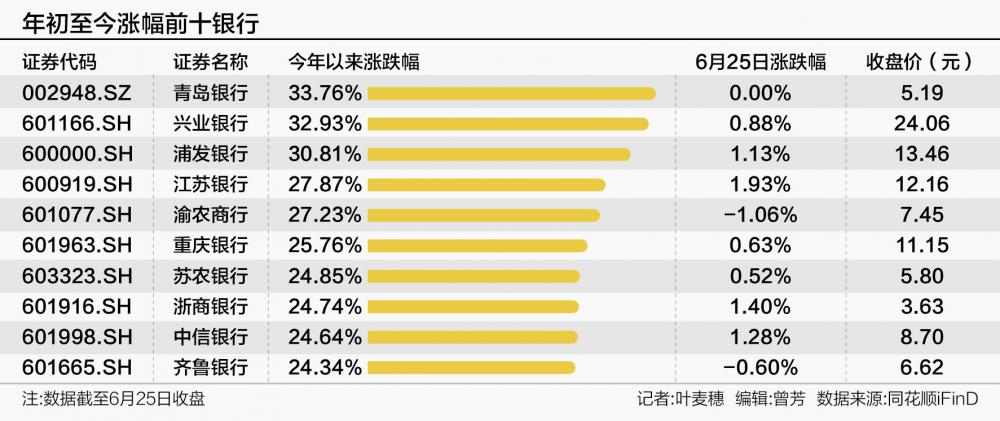 根据同花顺统计,今年已先后有18只银行股创出历史新高,成绩斐然。年初至今没有1只银行股出现下跌,全部收红,其中涨幅超过20%的银行股有16只,涨幅超过10%的银行股则达到了32只。