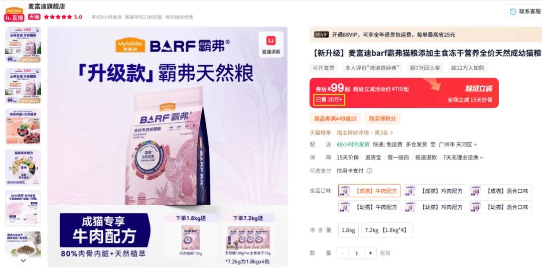 《21CBR》记者在麦富迪天猫旗舰店看到,一款全价天然成年猫粮(牛肉配方),1.8kg售价99元,约合55元/kg,显示已售出超30万单。