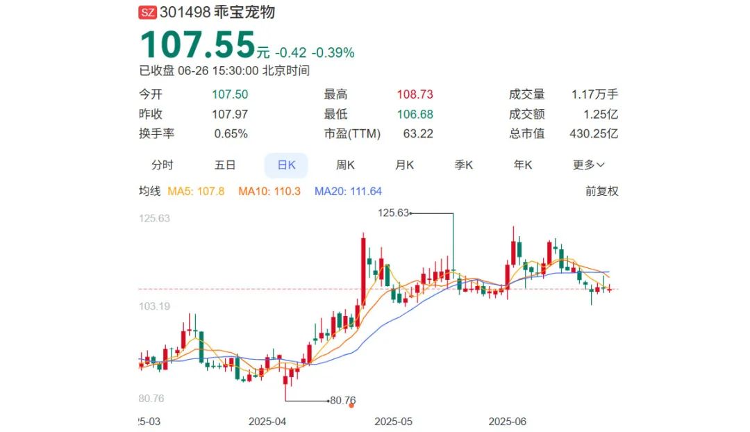 6月26日,乖宝宠物收报107.55元/股,总市值约430亿元,今年以来涨幅超40%。