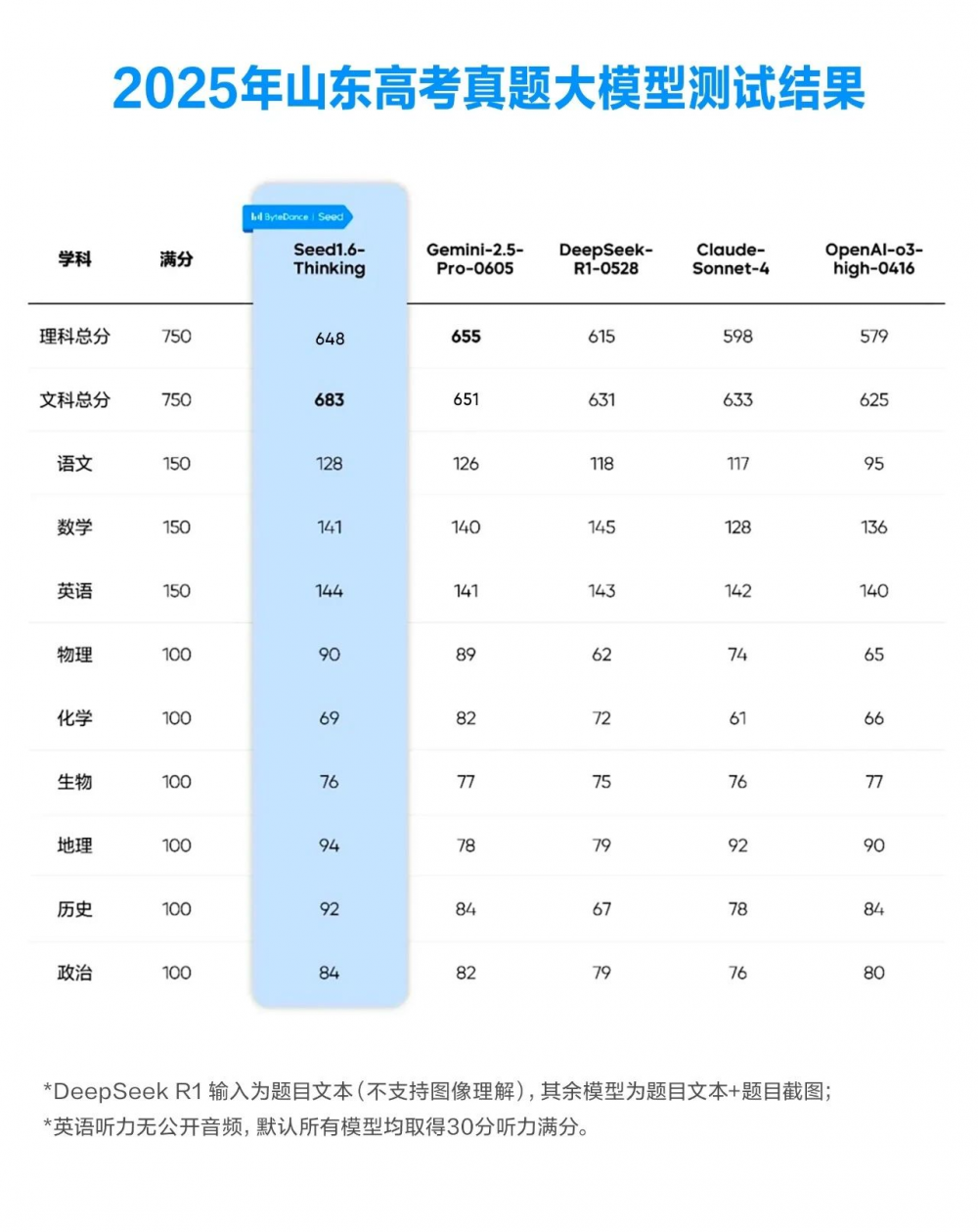 日前,字节跳动Seed团队公布2025高考全科测试结果。该测试采用全国新一卷和山东省自主命题,豆包Seed1.6-Thinking模型的文科和理科成绩分别达到683分和648分。在同期测试的国内外5款顶级模型中,豆包文科成绩获最高分,理科仅次于谷歌Gemini 2.5 Pro,后者成绩为655分。
