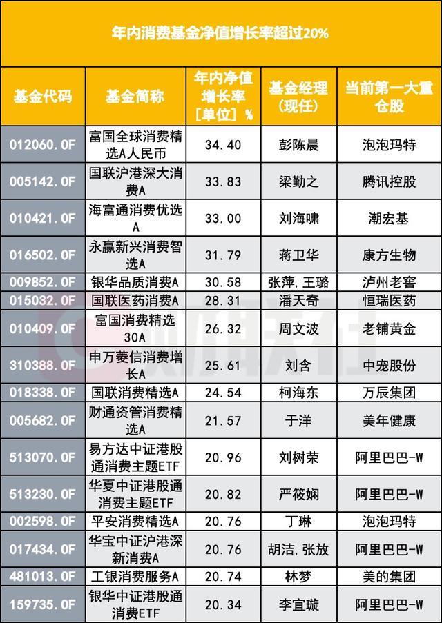 紧随其后的国联沪港深大消费、海富通消费优选、永赢新兴消费智选等产品也均录得超过30%的涨幅。从重仓股情况来看,泡泡玛特几乎成为这一批消费主题基金的“标配”,老铺黄金等新贵也频繁出现在前十大重仓股中。