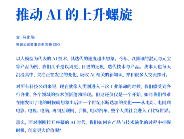 马化腾最新发文:只有AI不断向善,才能牵引产品质变、生态蓬勃