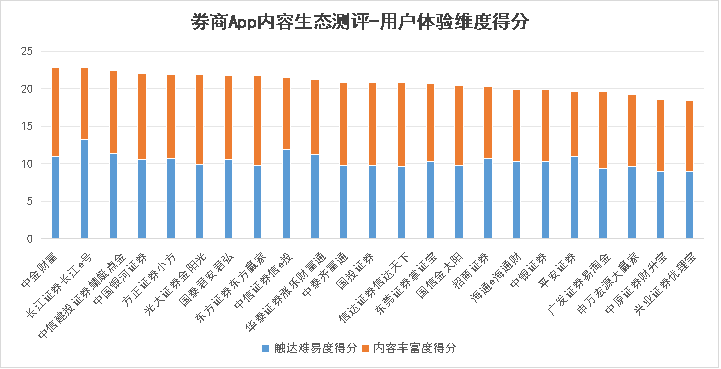 此维度中测评组关注的第一个指标是触达难易度,采取定性和定量两种方式测评23个App主页中的内容触达入口及触达难易度,在一定程度上能够体现用户在券商App中触达内容的便利性和App中内容布局的广泛性。