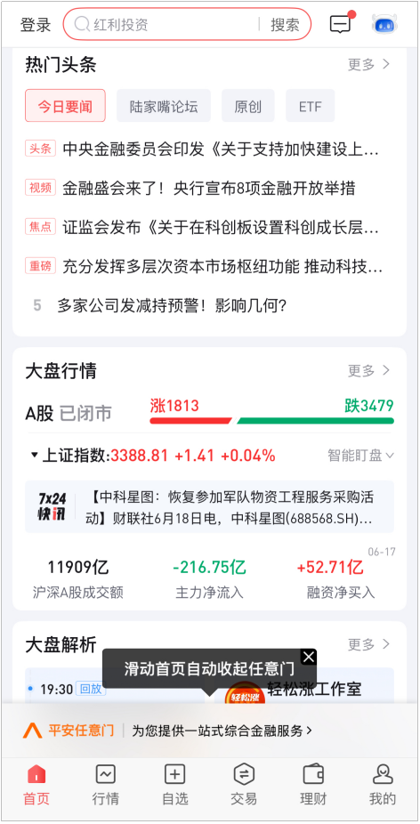 券商App测评结果显示,23个App中有16个内容触达入口超过20个,按入口位置不同大致可以分为首页固定入口、中部信息流入口、底部入口三类。其中,平安证券、中信证券信e投、中信建投证券蜻蜓点金、方正证券小方、申万宏源大赢家、长江证券长江e号、信达证券信达天下7个App的首页固定入口均超过10个,招商证券、中金财富分别设置12个、10个中部信息流入口。
