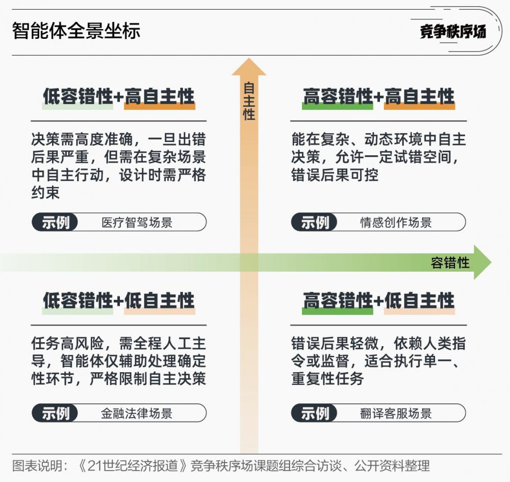 如果仅停留在单一角度分类智能体是非常片面的,为了更全景地认知理解智能体,我们广泛地调研了从业者,认为可以从“容错性”“自主性”两个维度划定坐标轴,建立智能体的价值生态。