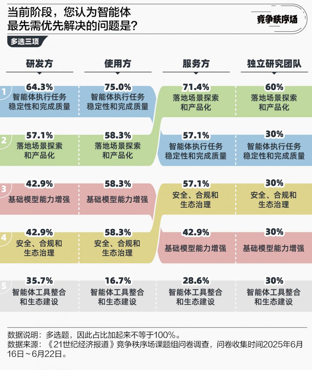 在这三个问题上,不同角色眼中的优先级不同。研发者和使用者认为最需要解决的问题是“智能体执行任务稳定性和完成质量”,而服务方和独立研究团队更需要“落地场景探索和产品化”。