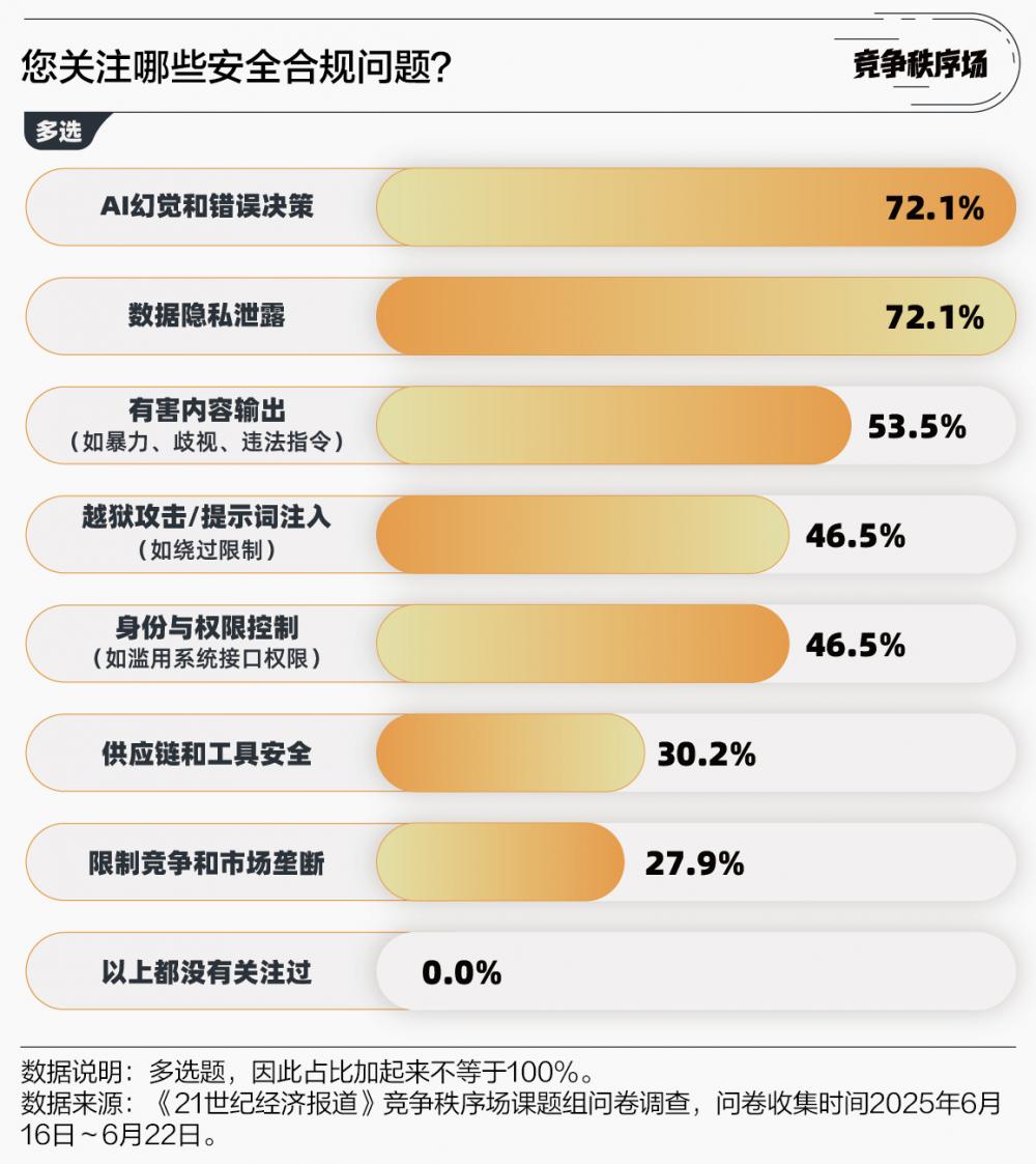 更专业的越狱攻击、身份与权限控制、工具安全和竞争秩序问题,相对获得较少关注。值得一提的是,没有受访者一个安全合规问题都没关注过。
