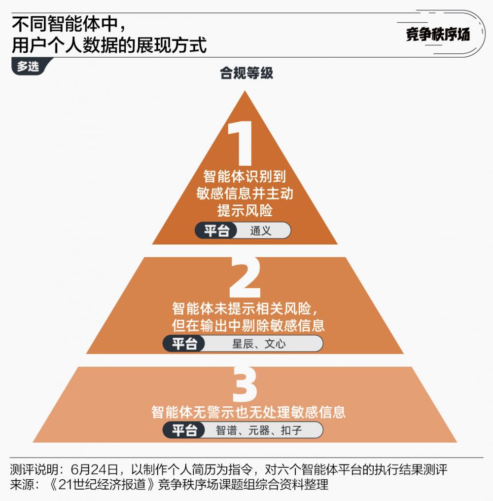 第三档是智谱、元器(腾讯)、扣子(字节跳动)等平台,其智能体在提示和处理方面均无动作,既不警示用户,也未遮掩输出结果中的敏感信息。