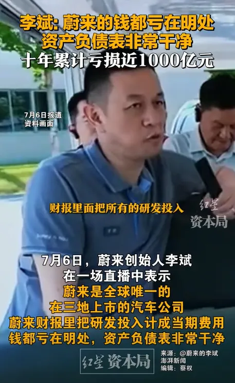 7月6日,在安徽合肥的蔚来智能工厂,蔚来创始人、董事长兼CEO李斌对这一问题进行了“犹抱琵琶半遮面”式回应。他表示,蔚来一直以来的底色是技术创新,累计研发投入达到600亿元。蔚来财报里把研发投入计成当期费用,钱都亏在明处,资产负债表非常干净。