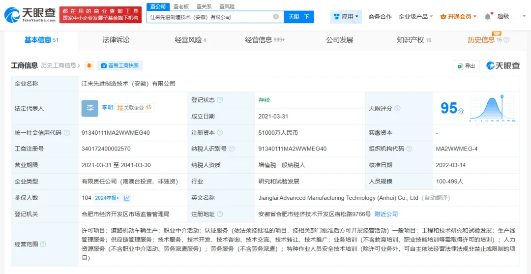 7月7日,天眼查App显示,近日,江来先进制造技术(安徽)有限公司新增1条注销备案公告,注销原因为决议解散,公告期为6月10日至7月24日。该公司成立于2021年3月,法定代表人为李明,注册资本5.1亿元人民币,经营范围包括道路机动车辆生产、生产线管理服务、供应链管理服务等,由蔚来控股有限公司、安徽江淮汽车集团股份有限公司共同持股。