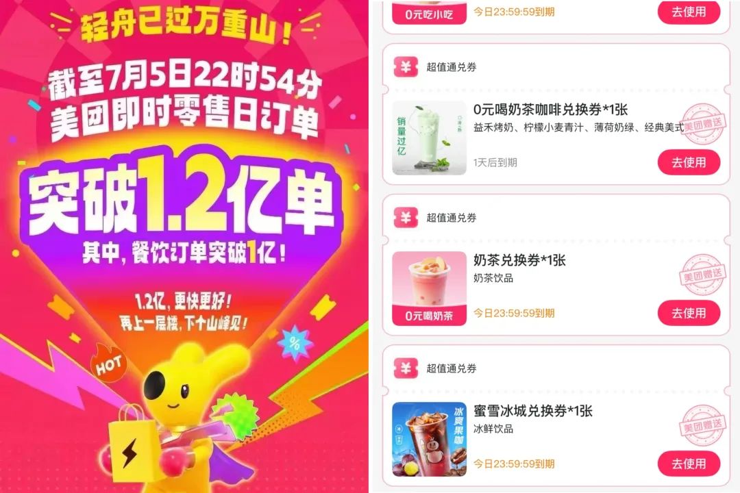 值得一提的是,当天不少网友在朋友圈分享:截至7月5日22时54分,美团内网显示平台即时零售日订单突破1.2亿单,其中餐饮订单已超过1亿单,高于去年立秋“秋天第一杯奶茶”所创造的历史峰值。