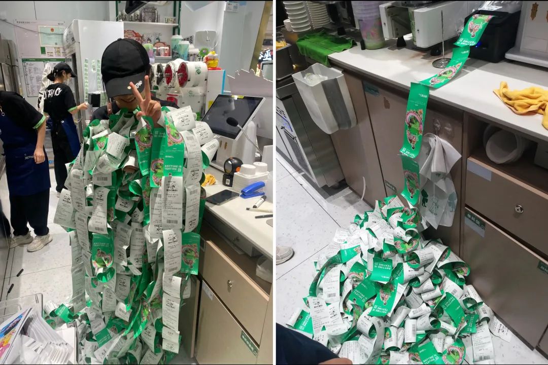 而线下门店则直接陷入“爆单”模式,蜜雪冰城、古茗、茶百道、1点点等品牌部分门店的订单小票长达数米,更有门店“预订单一路贴到了天花板”。