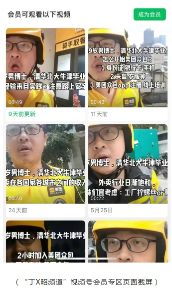 美团还表示,在“丁X昭频道”账号中,其共发布49条视频,有19条身着美团骑手服(7条在会员区,需付费观看),多数视频将“39岁男博士 清华北大牛津毕业生”放在封面标题。其中,高考前后(6月8日到15日),丁X昭密集发布了13条视频(包含会员专区),视频流量明显较日常视频暴涨数倍,账号置顶的两条视频主题为“高考要放平心态”“回应学历争议”,转发量均为“10W+”。最新一条视频于7月1日发布在会员区,视频中他身穿骑手服,站在外卖取餐柜前谈“跑单经验”。
