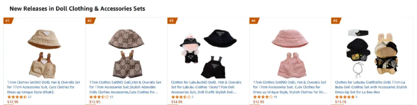 其中,最热销的类目为Labubu相关服饰套装。在亚马逊“Doll Clothing & Accessories Sets”的新品热销榜上,销量排名前五的产品均为符合Labubu尺寸(或产品图片直接使用Labubu为“模特”)的服饰产品。其中榜首的“工作服”上月销量已过千。
