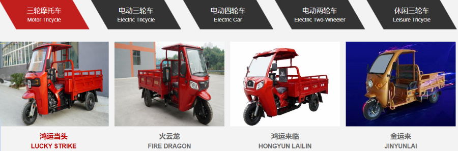 查询官网发现,该公司的电动三轮车产品命名包括霹雳、悍擎、途威等,三轮摩托车产品则以鸿运当头、金运来、火云龙等命名。