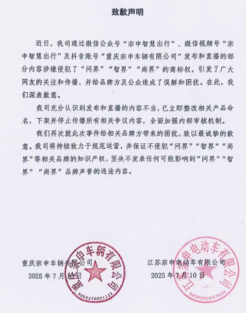 近日,我司通过微信公众号“宗申智慧出行”、微信视频号“宗申智慧出行”及抖音账号“重庆宗申车辆有限公司”发布和直播的部分内容涉嫌侵犯了“问界”“智界”“尚界”的商标权,引发了广大网友的关注和传播,并给品牌方及公众造成了误解和困扰。在此,我们深表歉意。