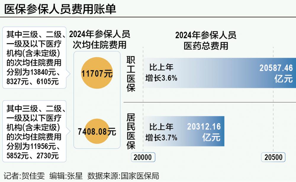 国家医保局发布的《2024年全国医疗保障事业发展统计公报》显示,2024年职工医保参保人员医药总费用20587.46亿元,比上年增长3.6%;2024年居民医保参保人员医药费用20312.16亿元,比上年增长3.7%。