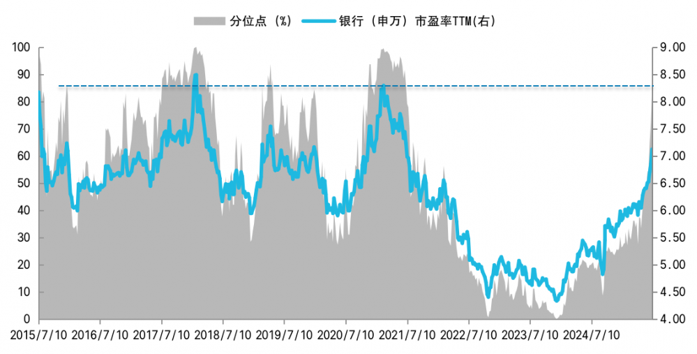 经历持续上涨后,当前银行行业整体估值水平有所抬升,其滚动市盈率处于近10年的83%分位,正在逼近2018年跟2021年的高点。短期来看,估值修复带来的快速上涨或将放缓,股价波动也可能随之加大。