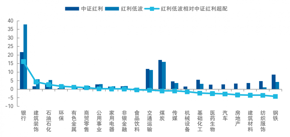 中证红利低波动指数在高股息的基础上考虑了“低波动”因子,让股价波动较小的银行、公用事业等板块在其中占据较大权重,煤炭、化工等强周期属性行业的权重有所降低。