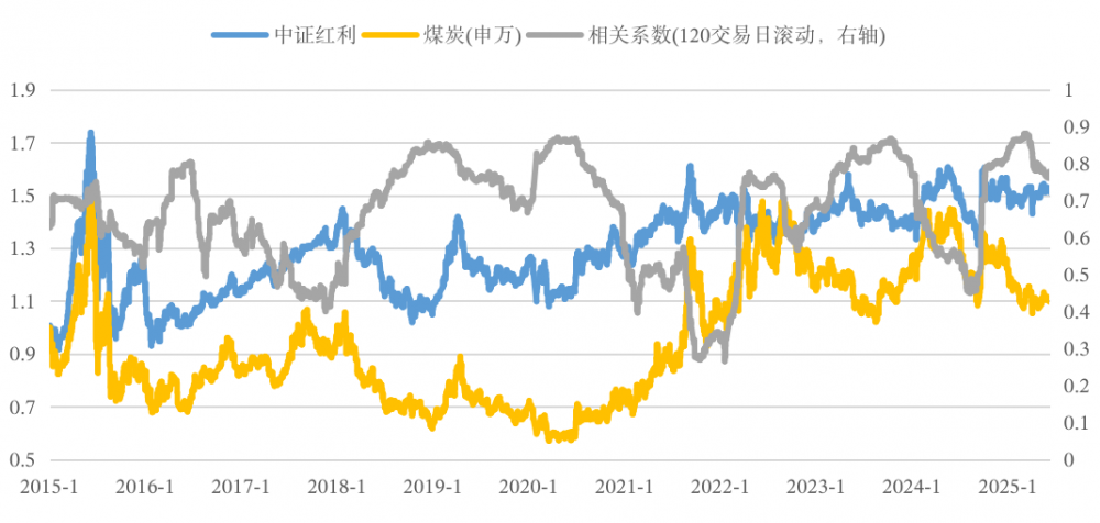 但如果我们回顾历史上类似行情,可以发现当中证红利指数和银行股走势的相关系数(下称相关系数)攀升至0.9左右的历史高位时,红利行情基本由银行股在推动,则后续一段时间内,红利内部很可能会发生风格切换,煤炭等周期属性较强的红利类资产往往有比较不错的表现。