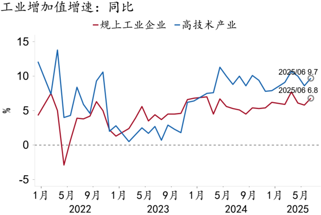 6月工业生产增长加快,规上工业增加值同比增长6.8%(市场预期5.5%),增速较5月显著加快1.0pct;基调环比增速0.5%,较5月放缓0.11pct。中美关税缓和、“两重”“两新”政策效能释放、高技术高端智能产业带动三方面因素支撑工业生产提速。值得注意的是,供强需弱格局持续之下,工业产销率下降至94.3%,连续两个月下降,企业竞争压力加剧。分行业看,高技术产业(9.7%)和装备制造业生产加快。汽车(11.4%)、电气机械(11.4%)、计算机电子(11.0%)保持较快增长。服务业生产指数保持较快增长,同比增长6.0%,较5月小幅放缓0.2pct。服务业商务活动指数(50.1%)和业务活动预期指数(56.0%)均较上月小幅放缓,但仍处扩张区间。前瞻地看,工业和服务业生产有望保持平稳较快增长,国内“反内卷”和国际贸易摩擦或将对部分中下游行业生产造成一定压力。