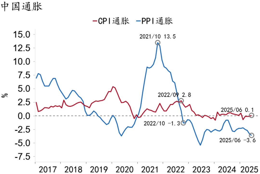 通胀走势分化,企业部门价格压力上升。6月CPI通胀为0.1%,连续四个月为负后温和转正,其中原油分项拖累减轻,核心CPI通胀在消费较强的支撑下回升至0.7%。PPI通胀为-3.6%,连续第3个月回落,环比跌幅为历史同期高位,主要受建筑业景气度弱于历史同期、关税冲击加剧供需失衡、部分行业竞争加剧,以及购物节促销导致消费品折价等多方面影响。前瞻地看,我国物价运行仍然面临较大压力,复苏斜率或较为平缓。综合整治“内卷式”竞争有助于价格企稳回升,但政策落地施行受供需两侧多重因素制约,“再通胀”的路径尚需探索。