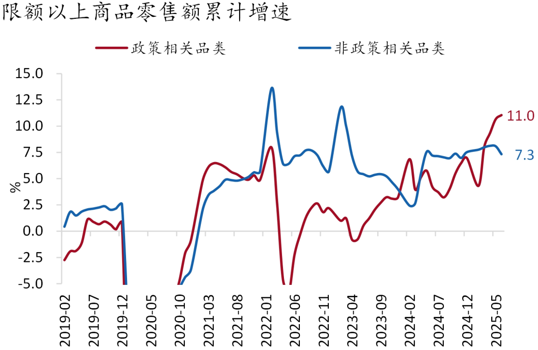 6月社零增速(4.8%)低于市场预期(5.6%),餐饮增长“急刹车”、部分省份暂停国补、购物节前置以及节假日错位均有拖累。商品消费增速下行1.2pct至5.3%,三个结构性特征共同指向政策驱动之外,消费的内生修复动能仍待增强。一是观察限额以上商品社零,非补贴品类增速较上月下降4pct至3.9%,单月增速是2024年以来低位,同时,与补贴品类(12.6%)的增速差扩大至8.7pct。二是非补贴品类中,必选消费如粮食、日用品类增速仍在8%左右,而可选消费如饮料烟酒、服装鞋帽、化妆品等增速降至零附近。三是补贴品类中,家用电器和通讯器材同比增速大幅下行近20pct,既有补贴暂停的直接影响,也体现耐用品需求透支,补贴效果边际减弱。