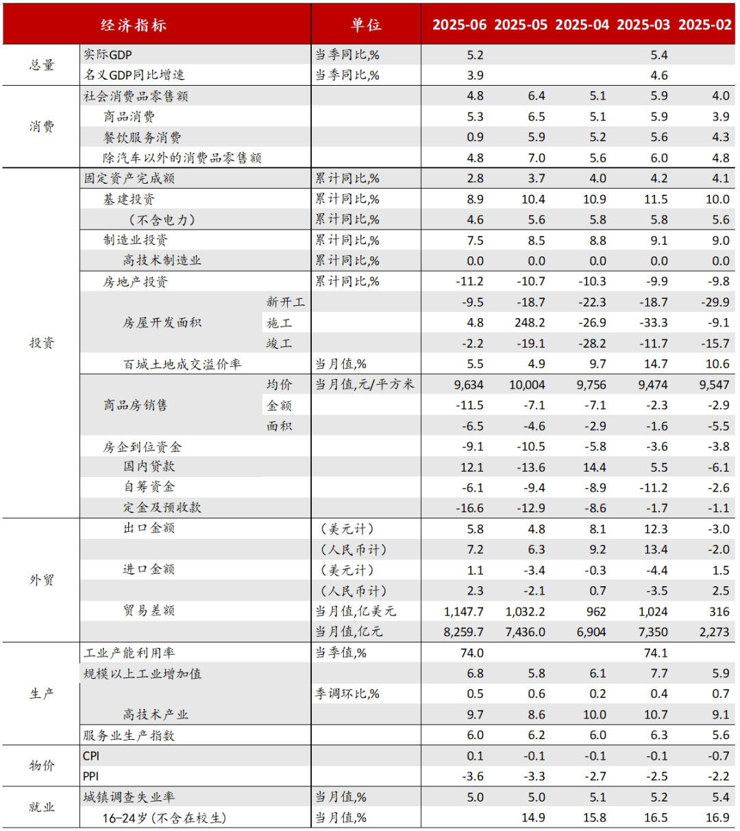 二季度我国经济直面关税逆风,如期稳中向好。实际GDP同比增长5.2%,较一季度小幅下行0.2pct。上半年实际GDP累计同比增长5.3%,全年经济增速达标的概率继续提升。总体上看,二季度经济呈现三个特征。