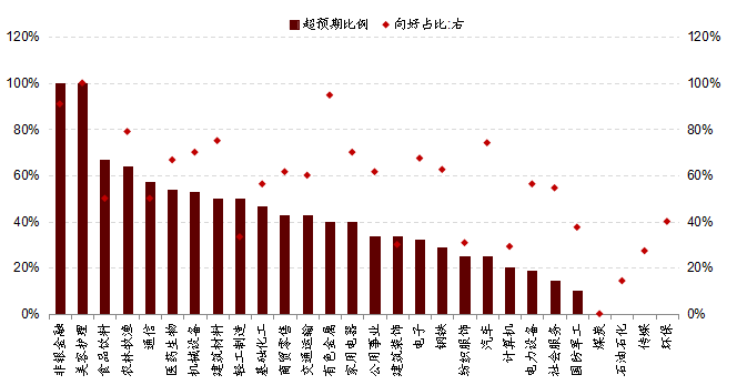 ▍图2:2025H1各行业中报业绩预告超预期占比:非银金融、美容护理、食品饮料、农林牧渔、通信等行业超预期占比靠前