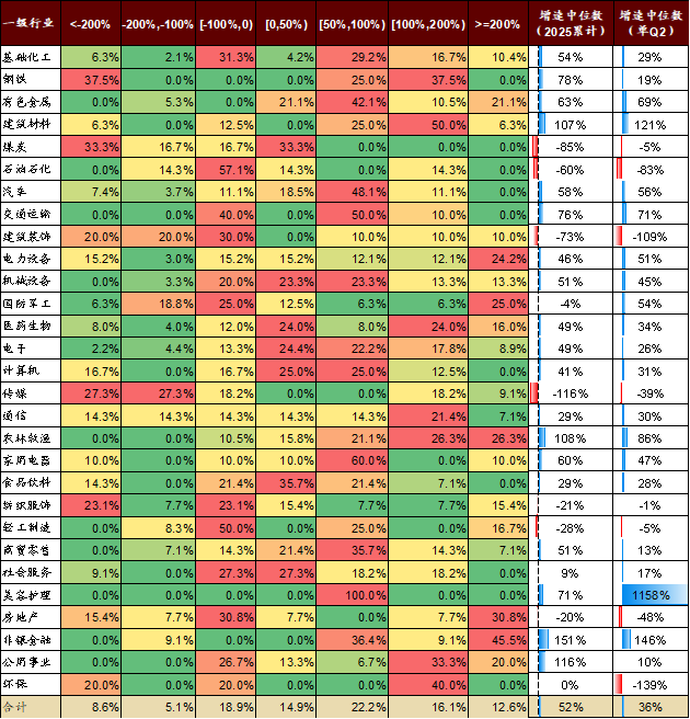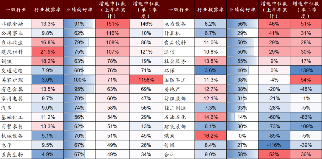从目前披露的各行业增速中位数来看,非银金融、公用事业、农林牧渔、建筑材料等行业增速中位数较高。单二季度来看美容护理、非银金融、建筑材料、有色金属、国防军工等行业增速中位数较高。