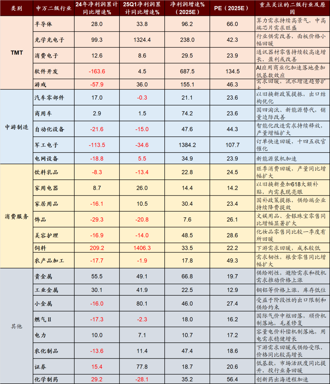综合以上,考虑到五六月份关税的扰动,部分领域生产端和投资端增速均放缓,PPI同比降幅持续扩大,掣肘企业利润率的恢复,预计整体A股中报盈利较一季度放缓,推荐重点关注业绩有望高增或改善的领域: