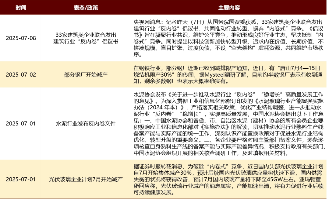 关于反内卷,后续需要关注分行业化解产业结构性矛盾的政策出台。从近期行业的表态来看,建筑、钢铁、水泥、光伏玻璃等行业对整治内卷有一定的表态。从后续关注点来看,政策预期上分行业化解产业结构性矛盾的政策尚未出台,有望尽快落地。从发改委表态来看,不同行业的整治手段或不尽相同:炼油、钢铁等行业或主要通过化解存量过剩产能的手段进行优化;煤化工、氧化铝等行业或通过遏制产能盲目扩张的手段进行控制;新能源汽车、光伏等“新三样”行业或通过行业自律—即加强企业行为约束的方式来进行监督。