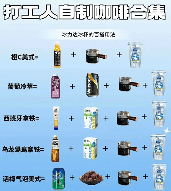 2024年,小红书平台上,“冰杯”词条的笔记数量破万,主要内容是DIY饮料的教程。有“资深人士”整理出了相关公式:冰杯+咖啡+椰汁=生椰拿铁;冰杯+橙汁+咖啡=橙C美式;冰杯+水溶C+养乐多=柠檬点点。