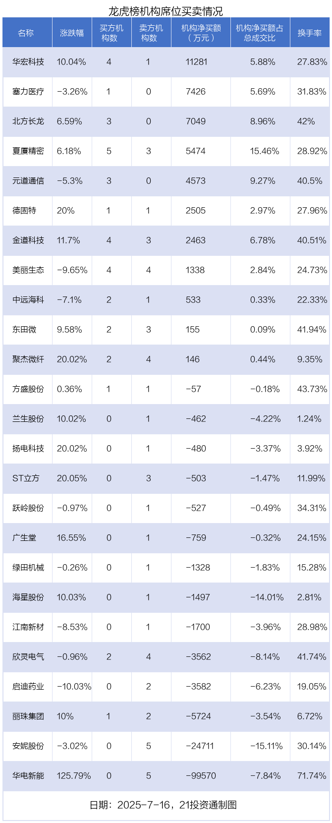 7月16日,25只个股龙虎榜出现了机构的身影,机构合计净卖出10.15亿元。具体来看,机构净买入11股,净卖出14股。
