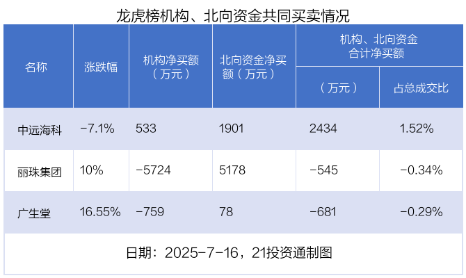 值得注意的是,机构和北向资金共同净买入了中远海科等1股;在丽珠集团,广生堂上出现分歧,机构净卖出丽珠集团5723.88万元,北向资金净买入5178.38万元;机构净卖出广生堂758.76万元,北向资金净买入77.67万元。