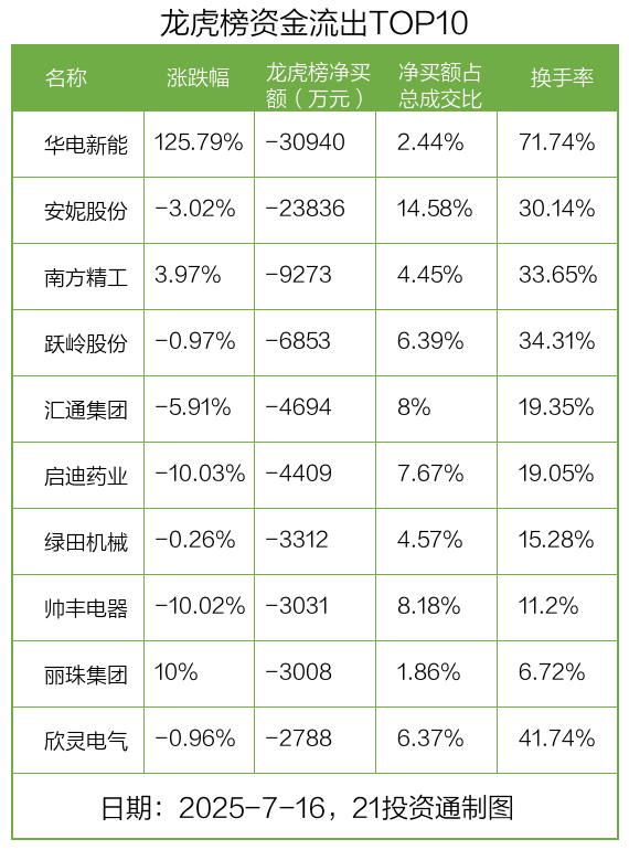 而龙虎榜中资金净流出最多的是华电新能(600930.SH),被净卖出为3.09亿元,占总成交金额的2.44%。华电新能收盘上涨125.79%,换手率为71.74%。