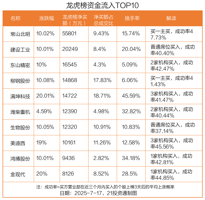 7月17日,上证指数上涨0.37%,深证成指上涨1.43%,创业板指上涨1.76%。盘后龙虎榜数据显示,共有49只个股因当日异动登上龙虎榜,资金净流入最多的是常山北明(000158.SZ),达5.58亿元。