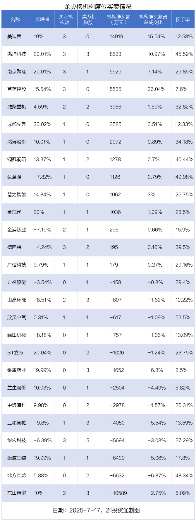 7月17日,27只个股龙虎榜出现了机构的身影,机构合计净买入6119.33万元。具体来看,机构净买入14股,净卖出13股。