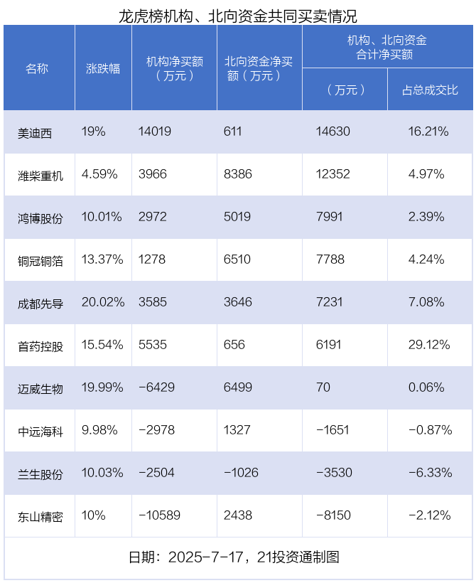 值得注意的是,机构和北向资金共同净买入了潍柴重机、铜冠铜箔、鸿博股份、成都先导、首药控股、美迪西等6股;共同净卖出了兰生股份;在迈威生物、东山精密、中远海科上出现分歧,机构净卖出迈威生物6429.21万元,北向资金净买入6499.32万元;机构净卖出东山精密1.06亿元,北向资金净买入2438.13万元;机构净卖出中远海科2978.43万元,北向资金净买入1327.23万元。