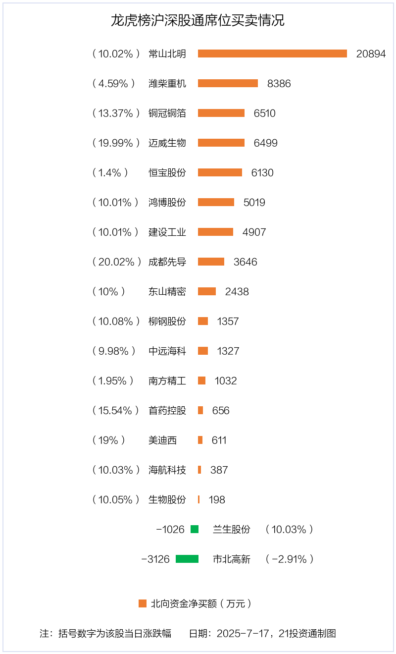 7月17日,北向资金参与龙虎榜中的个股共有18只,合计净买入6.58亿元。其中沪股通净买入7股,净卖出2股,合计净买入9203.24万元;深股通净买入9股,合计净买入5.66亿元。