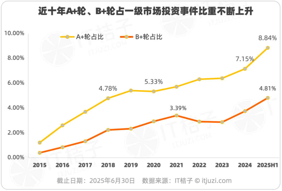 根据IT桔子数据,近十年来,国内A+轮、B+轮的投资事件在总的投资事件中的占比不断上升。