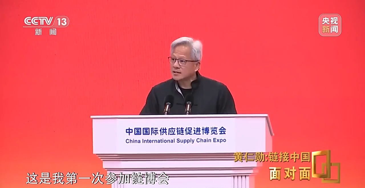链博会开幕式上,黄仁勋没有穿他那件标志性的皮衣,而是身着唐装,并用中文开场演讲。