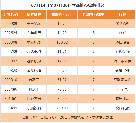 从券商推荐家数来看,7月14日至7月20日有289家上市公司得到券商推荐,其中宝丰能源获得9家推荐,完美世界、中际旭创均获得8家推荐。