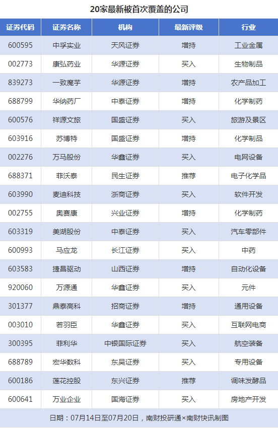 首次覆盖方面,7月14日至7月20日券商共给出了72次首次覆盖,其中中孚实业获得天风证券“增持”评级,康弘药业、一致魔芋分别获得华源证券“买入”、“增持”评级,华纳药厂获得中泰证券“增持”评级,祥源文旅获得国盛证券“买入”评级。