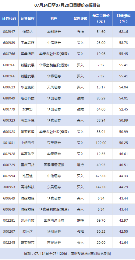 南财投研通数据显示,7月14日至7月20日,券商给予上市公司目标价共150次,按最新收盘价计算,目标价涨幅排名居前的公司有恒铭达、宝丰能源、隆鑫通用,目标价涨幅分别为62.16%、58.73%、55.45%,分别属于消费电子、化学原料、摩托车及其他行业。