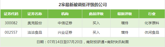 评级调低方面,7月14日至7月20日,券商调低上市公司评级达到2家次,中信证券对奥克股份的评级从“买入”调低至“增持”,兴业证券对洽洽食品的评级从“买入”调低至“增持”。